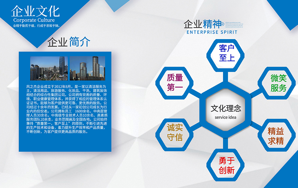 公司是一家以清潔服務為主,旅游,干洗、化妝品、裝修和餐飲相結合的多元化發(fā)展運營的服務性企業。企業本著誠信第一、服務至上的原則,依靠公司盡我所能、力我所及的信條從2012年到現在服務了多家企業,現在我們已經擁有了400家左右的清潔服務項目和多家洗衣店。我們會一直牢記服務,創(chuàng)新才是我們企業發(fā)展的服務宗旨。